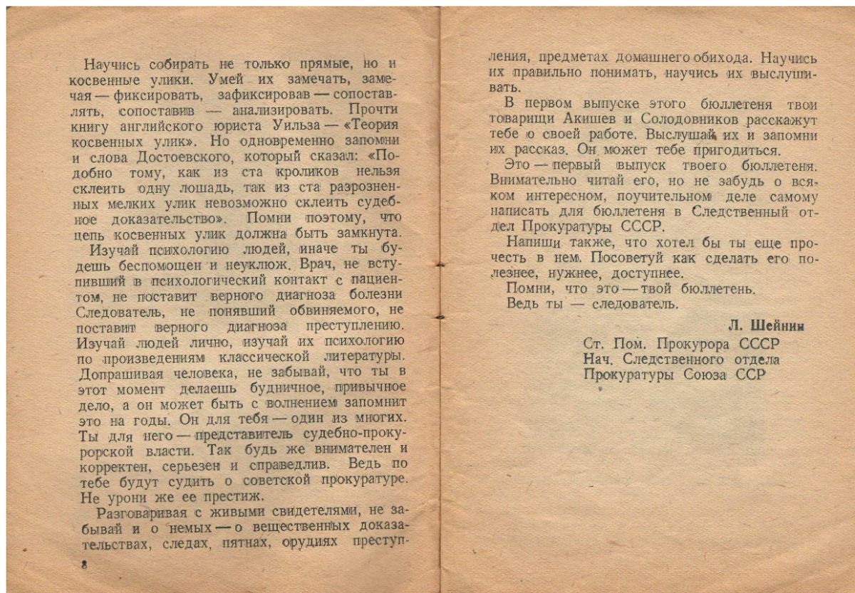 Привожу концовку напутствия следователям Начальника следственного отдела Прокуратуры Союза ССР Льва Шейнина(мы знаем его и как родоначальника советского детектива и автора «Записок следователя» см. http://modernlib.net/books/sheynin_lev_romanovich/zapiski_sledovatelya_stariy_znakomiy_rasskazi/read )
